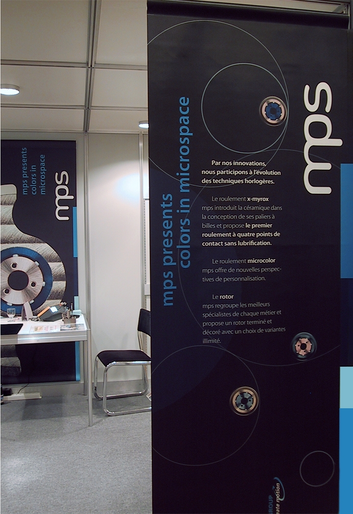 MPS est une société suisse spécialisée dans les roulements miniatures offrant des solutions sur mesure qui se distinguent par leur fiabilité, leur niveau élevé de précision et leur faible encombrement. Produit phare du savoir-faire MPS, la micro-bille acier ou céramique traduit l’ingénierie de l'entreprise "solutions in microspace". Point de départ de notre réflexion, la bille chromée agrandie devient monumentale; elle interpelle et établit la marque. La sphère est ainsi l'élément-clé de la visibilité du siège de l'entreprise et du stand EPHJ.